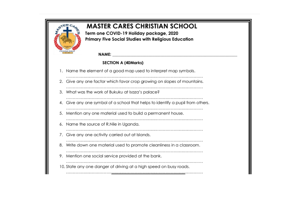 MASTER CARES CHRISTIAN SCHOOL Term one COVID-19 Holiday package, 2020 Primary Five Social Studies with Religious Education