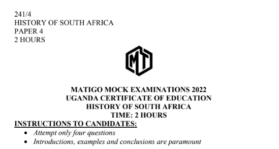 MATIGO MOCK EXAMINATIONS 2022 UCE HISTORY PAPER 4 SOUTH AFRICA