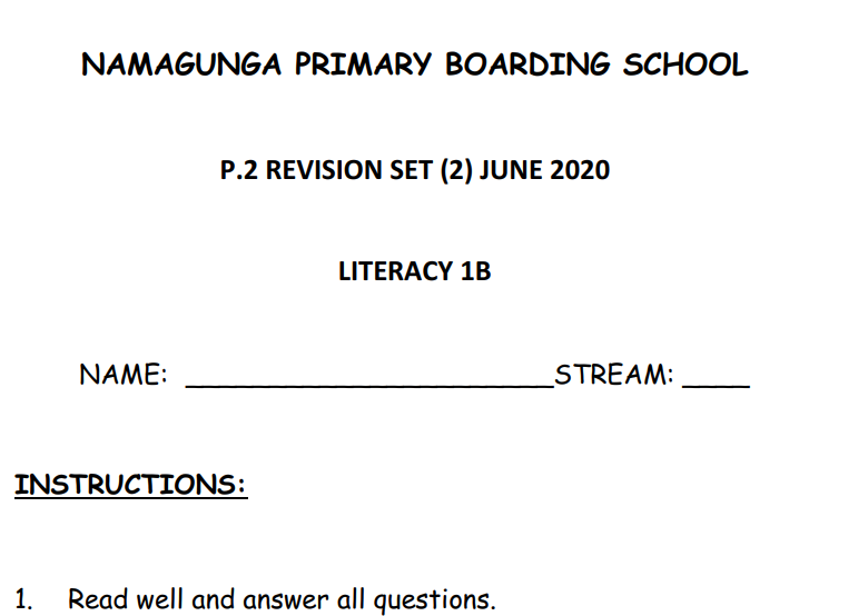NAMAGUNGA PRIMARY BOARDING SCHOOL P.2 REVISION SET (2) JUNE 2020 LITERACY 1B