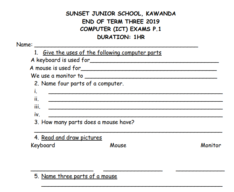 P.1 SUNSET JUNIOR SCHOOL, KAWANDA END OF TERM THREE 2019 COMPUTER (ICT) EXAMS
