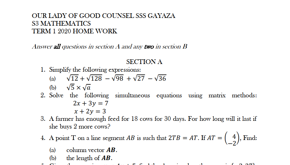 S.3 MATHEMATICS HOME WORK