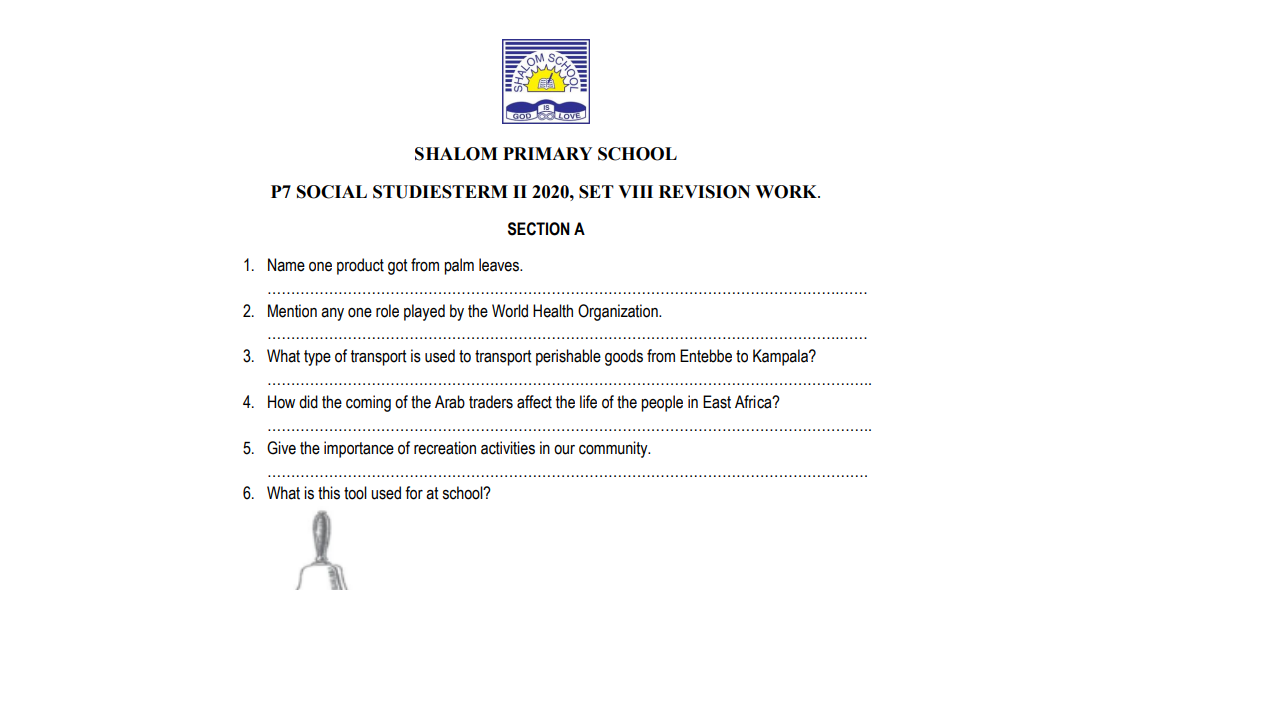 SHALOM PRIMARY SCHOOL P.7 SOCIAL STUDIES TERM II 2020, SET VIII REVISION WORK.