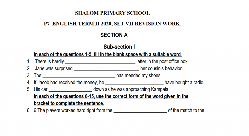 SHALOM PRIMARY SCHOOL P7 ENGLISH TERM II 2020, SET VII REVISION WORK