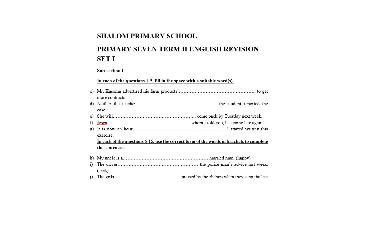 SHALOM PRIMARY SCHOOL PRIMARY SEVEN TERM II ENGLISH REVISION SET I