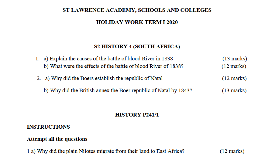 ST LAWRENCE ACADEMY, SCHOOLS AND COLLEGES HOLIDAY WORK TERM I 2020 S.2 HISTORY 4 (SOUTH AFRICA)