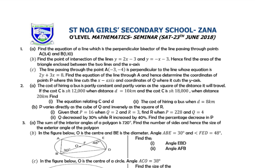 St. Noa Girl's Secondary School 2018 Mathematics Seminar Questions