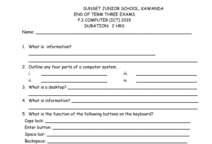 SUNSET JUNIOR SCHOOL, KAWANDA END OF TERM THREE EXAMS P.3 COMPUTER (ICT) 2019